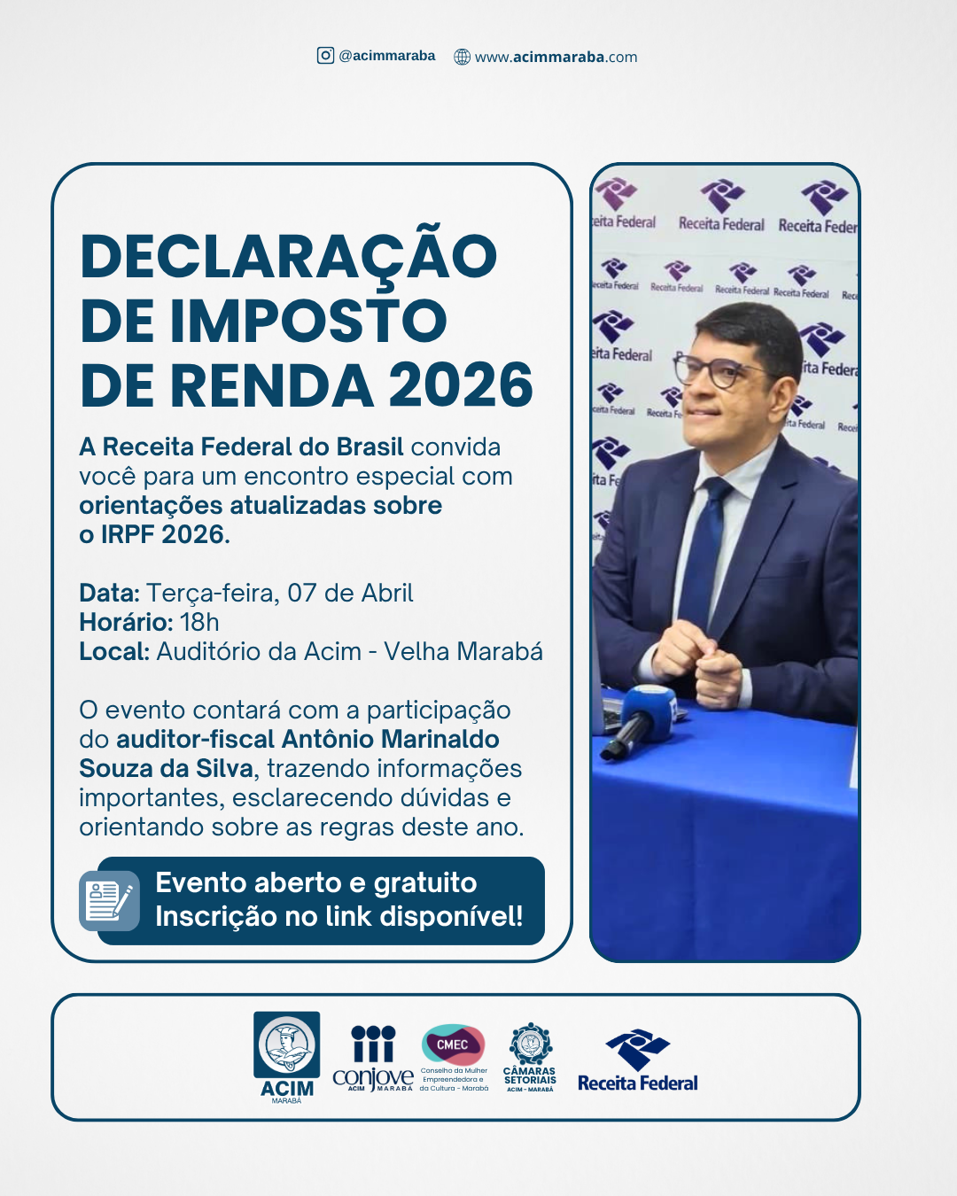 Participe deste encontro promovido pela Receita Federal em parceria com a ACIM e fique por dentro das principais regras, atualizações e orientações sobre a Declaração do Imposto de Renda 2026.